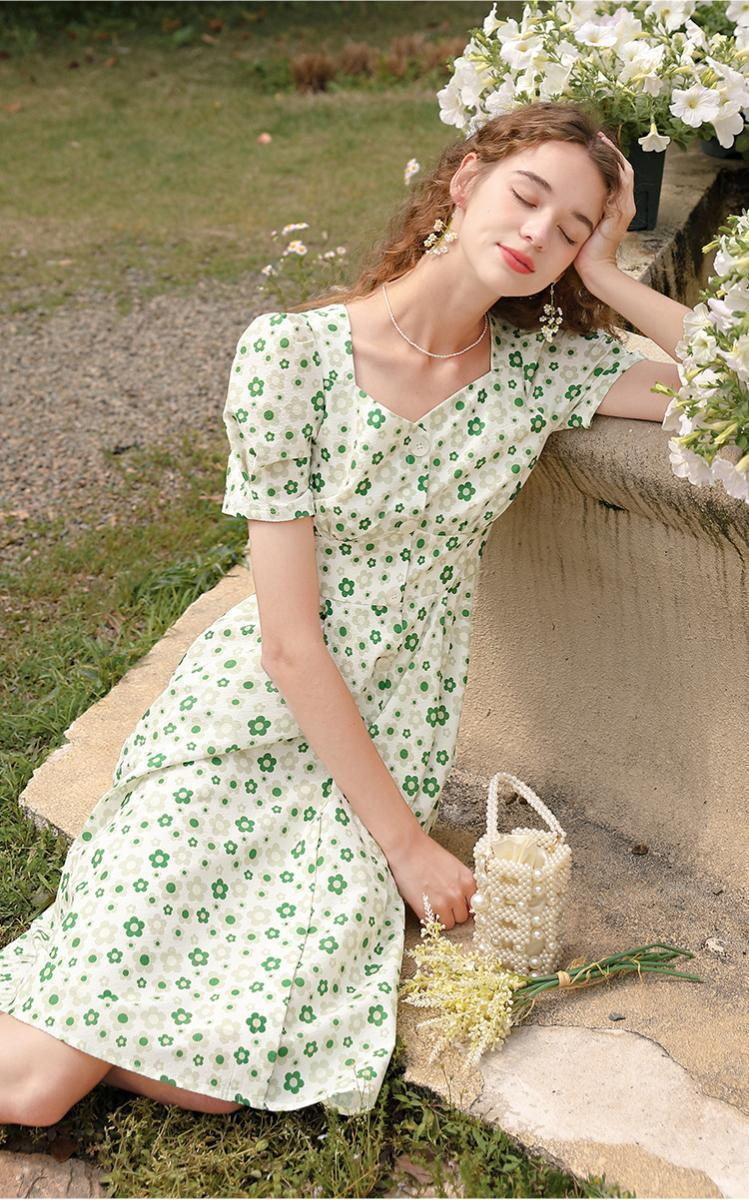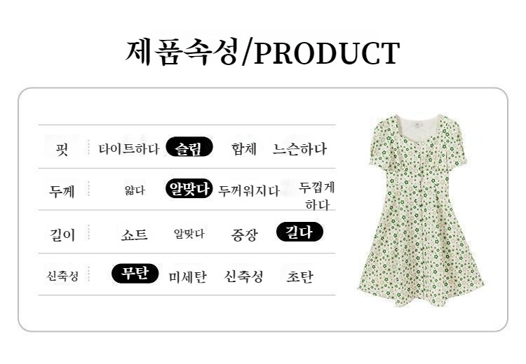 여름 허리 여리여리 디자인 원피스 여 패션 반팔 플라워 원피스 스퀘어넥 패션 반팔 원피스